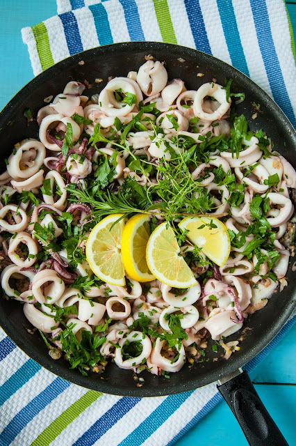 Probala sam razne stvari, da ih baš dobro isušim papirnatim ubrusom, jer su uvek pune vode, da ih pržim u manjim količina, ali one uvek ispuste neku funky tečnost tokom prženja. I onda sam rešila da ipak promenim fokus sa lignji na druge sastojke, i to začinsko bilje koga ovih dana imam u izobilju. Maslinovo ulje, beli luk i vino se podrazumevaju. I dobila sam jelo neverovatnog ukusa i mirisa. Znate ono kad uživate u nekom jelu ne samo dok ga jedete već satima posle toga, neko zadovoljstvo i radost vas obuzimaju dok pokušavate da se prisetite tog skoro magičnog iskustva.